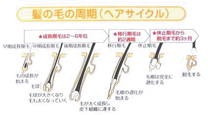ヘアサイクルは、 「生え始め」、 伸び続ける 「成長期」 (2〜6年)、 成長が終わり退化していく 「移行期」(約2週間)、 成長がストップしてから脱毛するまでの 「休止期」(約3ヶ月) の4つの段階に分けられます。 私達は動物と違って、「生え代わりの時期」 がないため、分かりにくいのですが、それでもだいたい5年周期でほぼ全体が生え代わっていると言われています。 そして、このサイクルがあるからこそ、抜け毛はあって当然と言えます。 普通は抜け毛が1日当たり50〜100本程度と言われています。 もし、それより多いように感じるのであれば抜け毛の状態をチェックしてみてください。 太い髪の毛であればヘアサイクルをまっとうして抜け落ちた毛であまり心配もいりませんが、細い髪の毛の場合はヘアサイクルが短縮されていると考えたほうが良さそうです。 また、薄毛を考えると、これはヘアサイクルのうち、成長期の期間が短くなり、細くて短い毛が多くなることにより結果的に次の図のようになります。